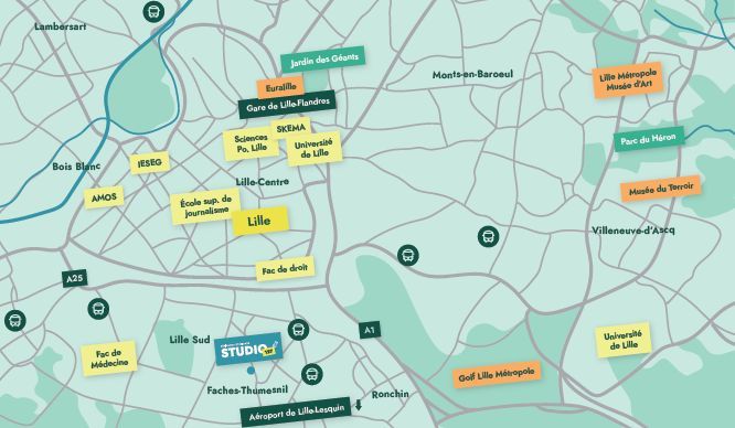 Le bus 7 est à 200 m avec un accès direct au métro et au centre de Lille. Une station V'Lille est à proximité avec 12 km de pistes cyclables. Un arrêt du futur tramway Lille-Lesquin est prévu à 700m, avec une mise en service prévue pour 2035.