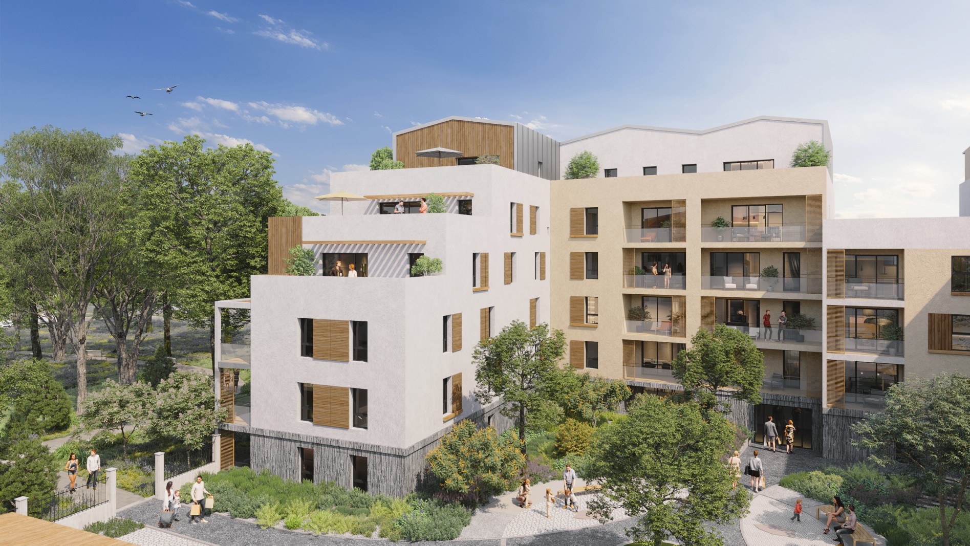 La résidence "JARDIN SAUVOLE" s'implante au sein de l'éco-quartier des 40 Arpents. Le bois apporte une note de raffinement. Afin de tirer le meilleur parti de son emplacement face au futur parc urbain, l’architecture multiplie les espaces extérieurs, dont de belles terrasses plein ciel disposées en cascade.
